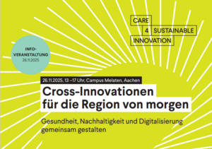 Das Innovationsprojekt Care for Sustainable Innovation treibt die digitale und nachhaltige Transformation der Gesundheitswirtschaft in der Region Aachen voran. Care for Sustainable Innovation wird im Rahmen des Förderaufrufes Regio.NRW – Transformation aus Mitteln des Europäischen Fonds für regionale Entwicklung (EFRE) und des Ministeriums für Wirtschaft, Industrie, Klimaschutz und Energie des Landes Nordrhein-Westfalen gefördert und baut auf den Ergebnissen des EFRE-Projektes Care and Mobility Innovation auf.